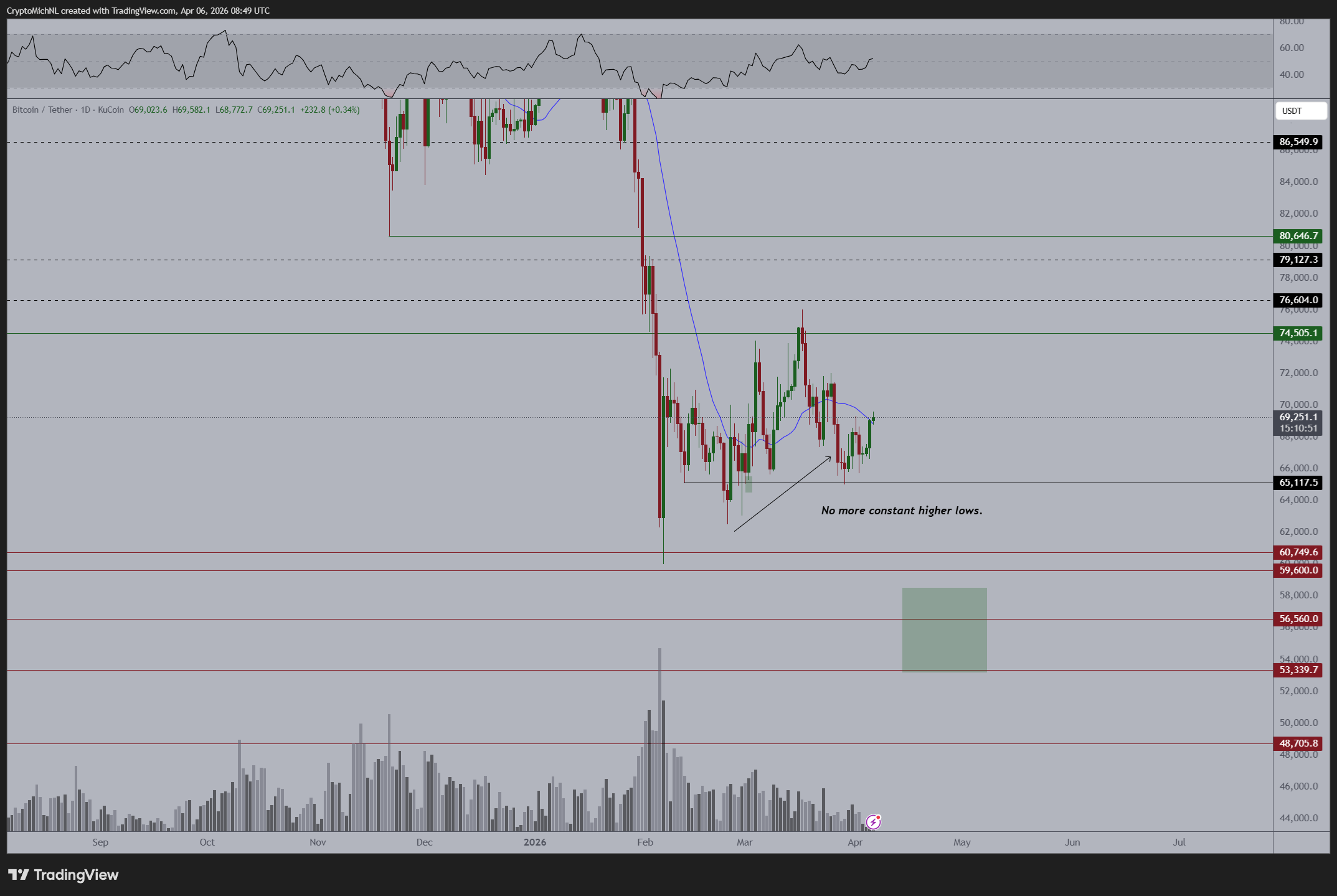 Data from TradingView showed BTC price action consolidating after hitting new April highs of $70,275 on Bitstamp.