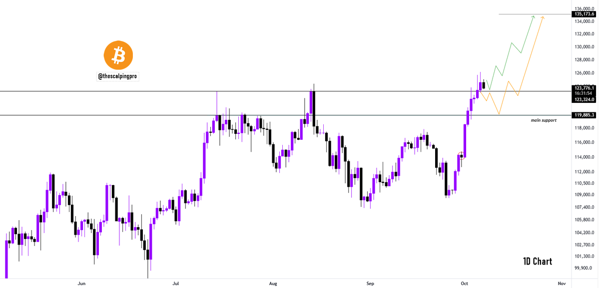 A daily candlestick close above this level could see Bitcoin “continue higher,” the analyst said, adding that the failure to hold this support could see a retest of the $120,000 zone.