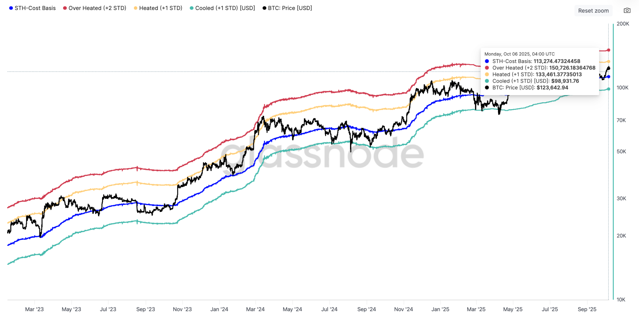 If it rises to retest the upper band — matching the one standard deviation above the STH realized price — it could hit fresh all-time highs at $133,460.