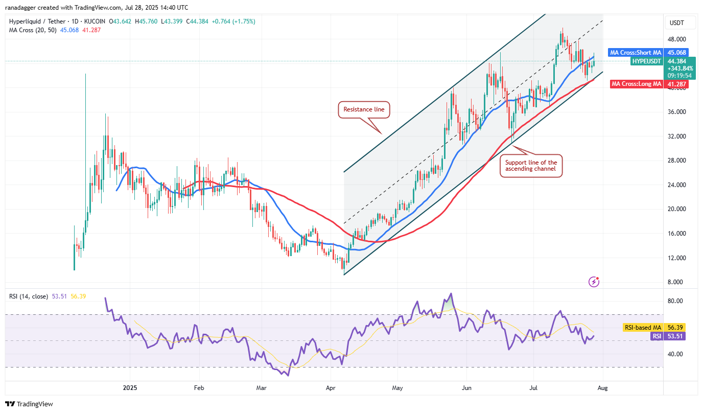 Hyperliquid (HYPE) rebounded off the support line of the ascending channel pattern on Friday, indicating buying on dips.