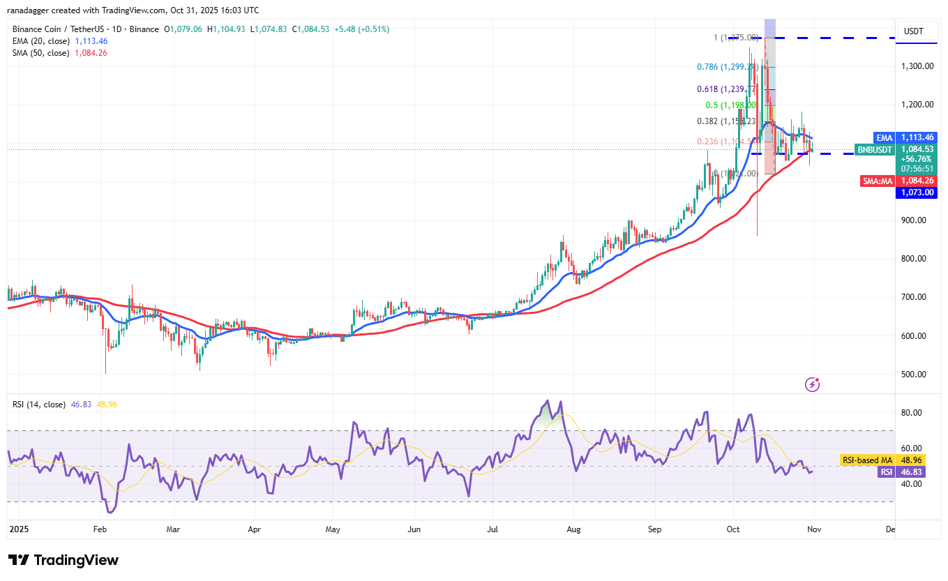 If the price turns down from the 20-day EMA ($1,113) and closes below the 50-day SMA, it signals the start of a deeper correction. The BNB/USDT pair could drop to $1,021 and later to $932.ย