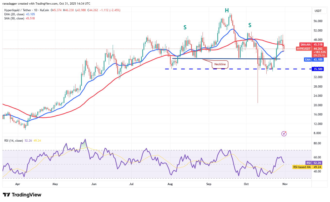 Sellers again thwarted attempts by the bulls to push the Hyperliquid (HYPE) price above the $51.50 overhead resistance on Thursday. That pulled the price down to the 20-day EMA ($43.10).