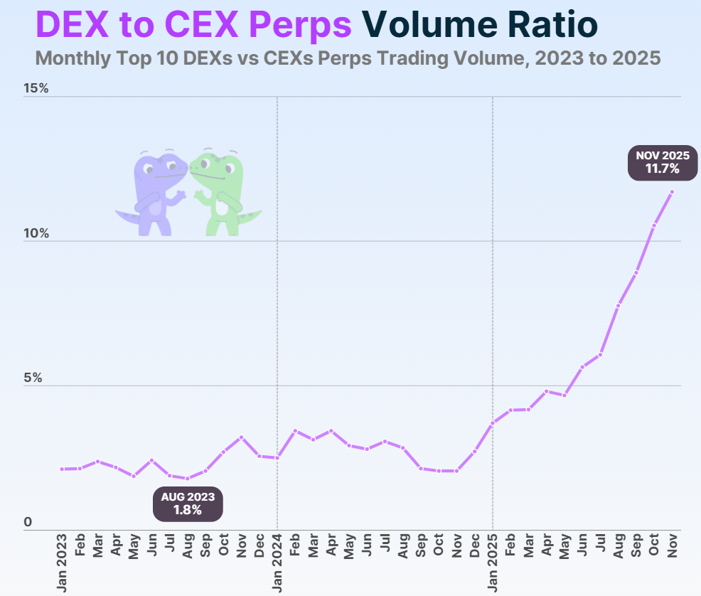 The market share of perpetual futures DEXs rose from 2.1% in January 2023 to a new all-time high of 11.7% in November 2025, according to a report by data aggregator CoinGecko.