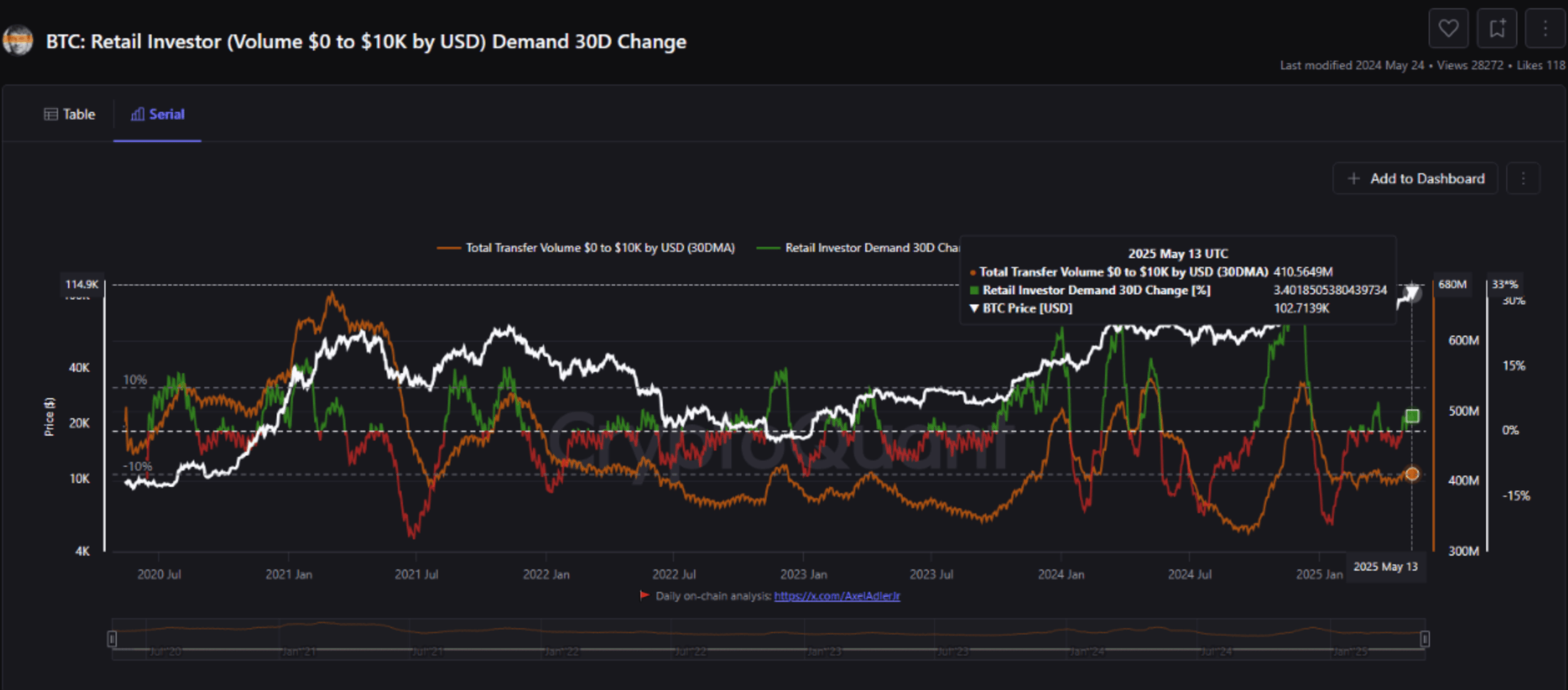 The BTC: Retail Investor 30-Day Change indicator reflects this trend. Since turning positive on April 28, the indicator has shown a 3.4% increase in retail buying through May 13, signalling a strong resurgence in small-investor activity.