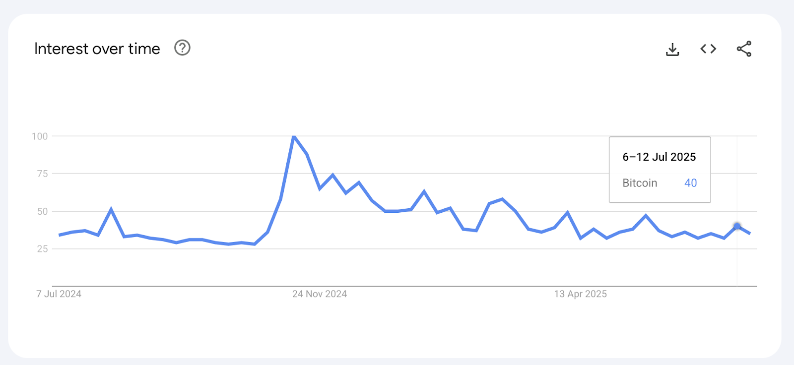 However, Bitcoin search interest is 60% lower than the week of Nov. 10–16, 2024, the week after Donald Trump won the US presidential election.