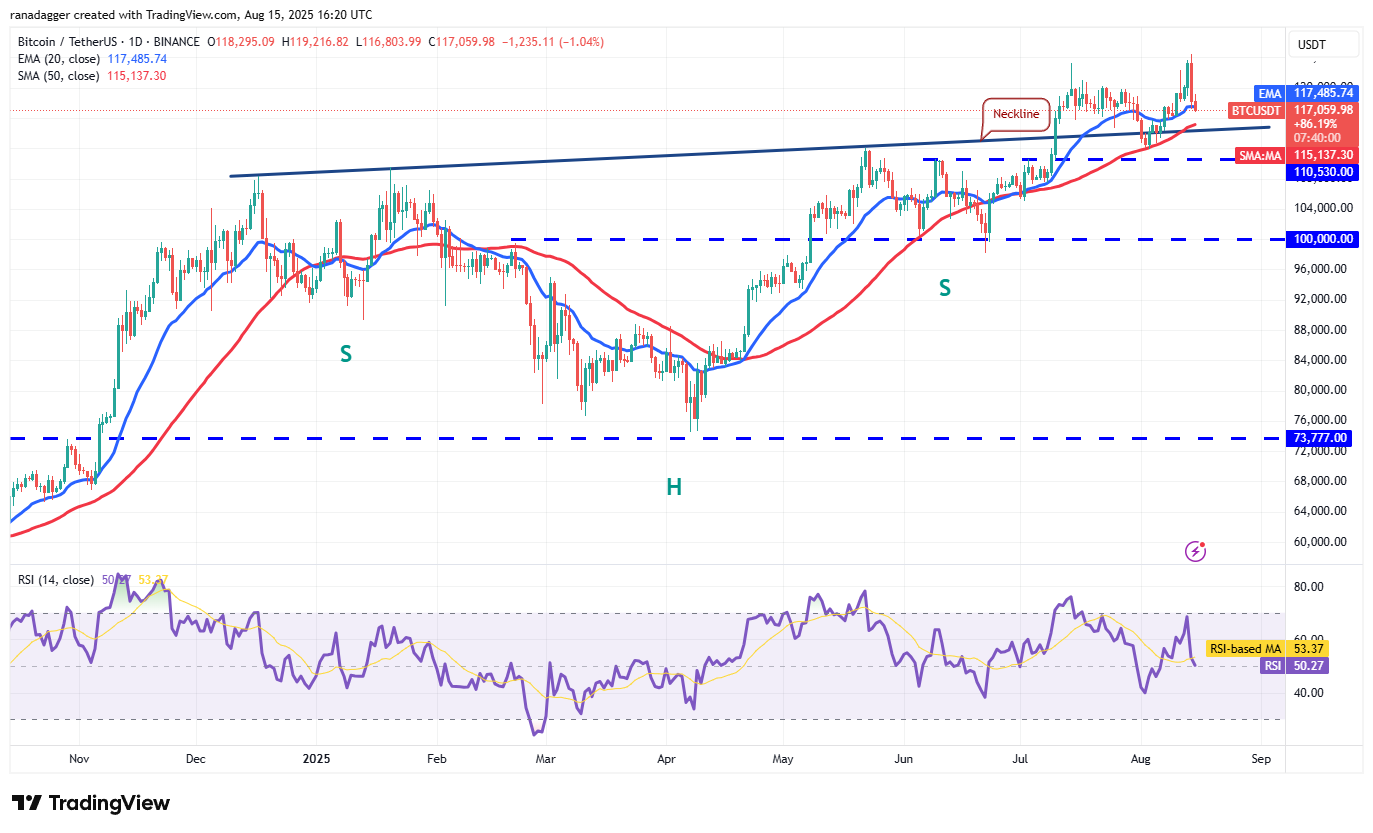 BTC has pulled back to the 20-day exponential moving average (EMA) ($117,485), which is a critical near-term support to watch out for.
