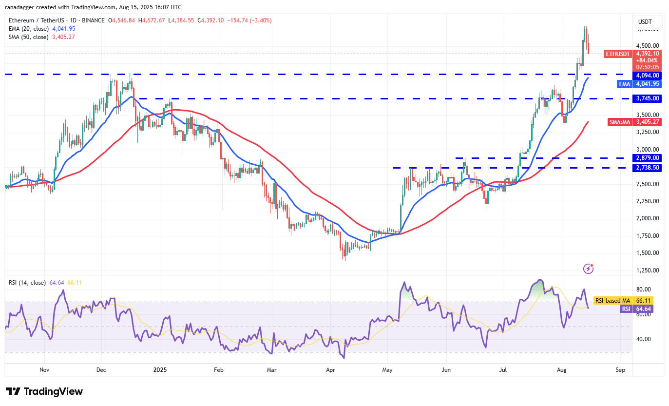 If the price rebounds off $4,094, it suggests that the bulls are trying to flip the level into support. If they do that, the ETH/USDT pair could rally toward the overhead resistance zone between $4,788 and $4,868. A close above $4,868 clears the path for a rally to the psychological level of $5,000 and, after that, to $5,662.ย