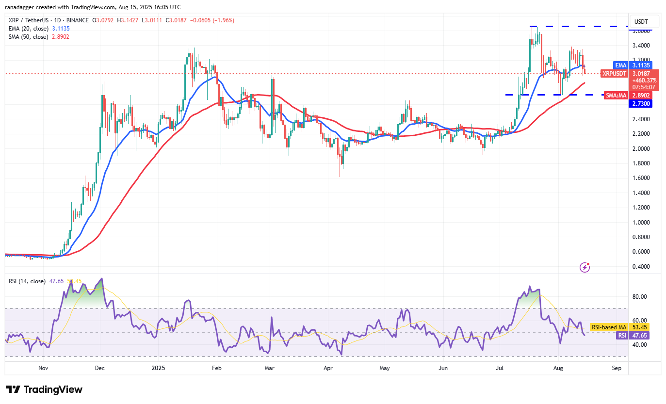XRP (XRP) turned down and broke below the 20-day EMA ($3.11) on Thursday, indicating a lack of demand at higher levels.