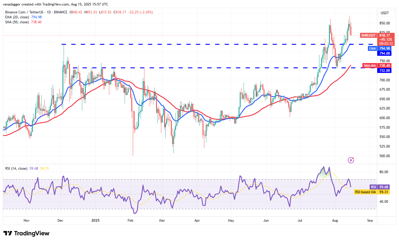 Failing to maintain the price above $861 may have tempted the short-term buyers to book profits. That has pulled the price toward the 20-day EMA ($794). If the price rebounds off the 20-day EMA with strength, the bulls will try to shove the BNB/USDT pair above $869. The BNB price may then soar to $900 and later to the psychological level of $1,000.