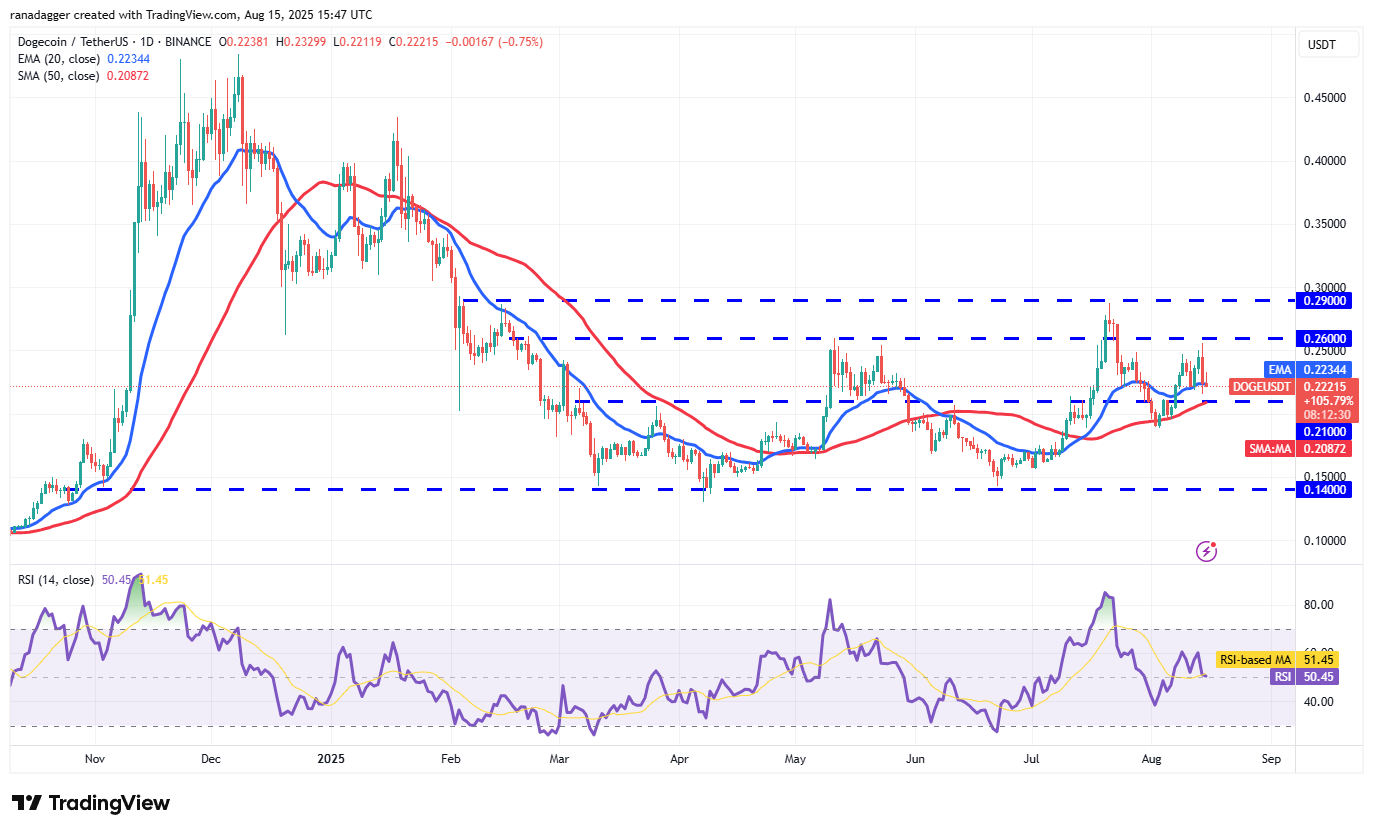 Dogecoin (DOGE) turned down from $0.26 and fell to the 20-day EMA ($0.22) on Thursday, signaling that the bears are active at higher levels.