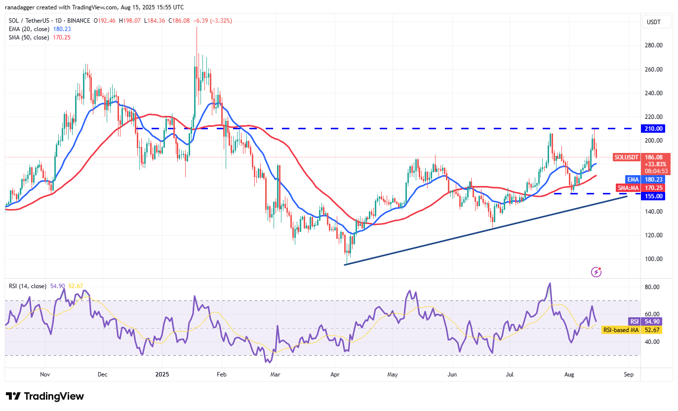 Solana (SOL) turned down from $210 on Thursday, signaling that the bears are selling on rallies. The price is nearing the 20-day EMA ($180), which is a vital level to keep an eye on.