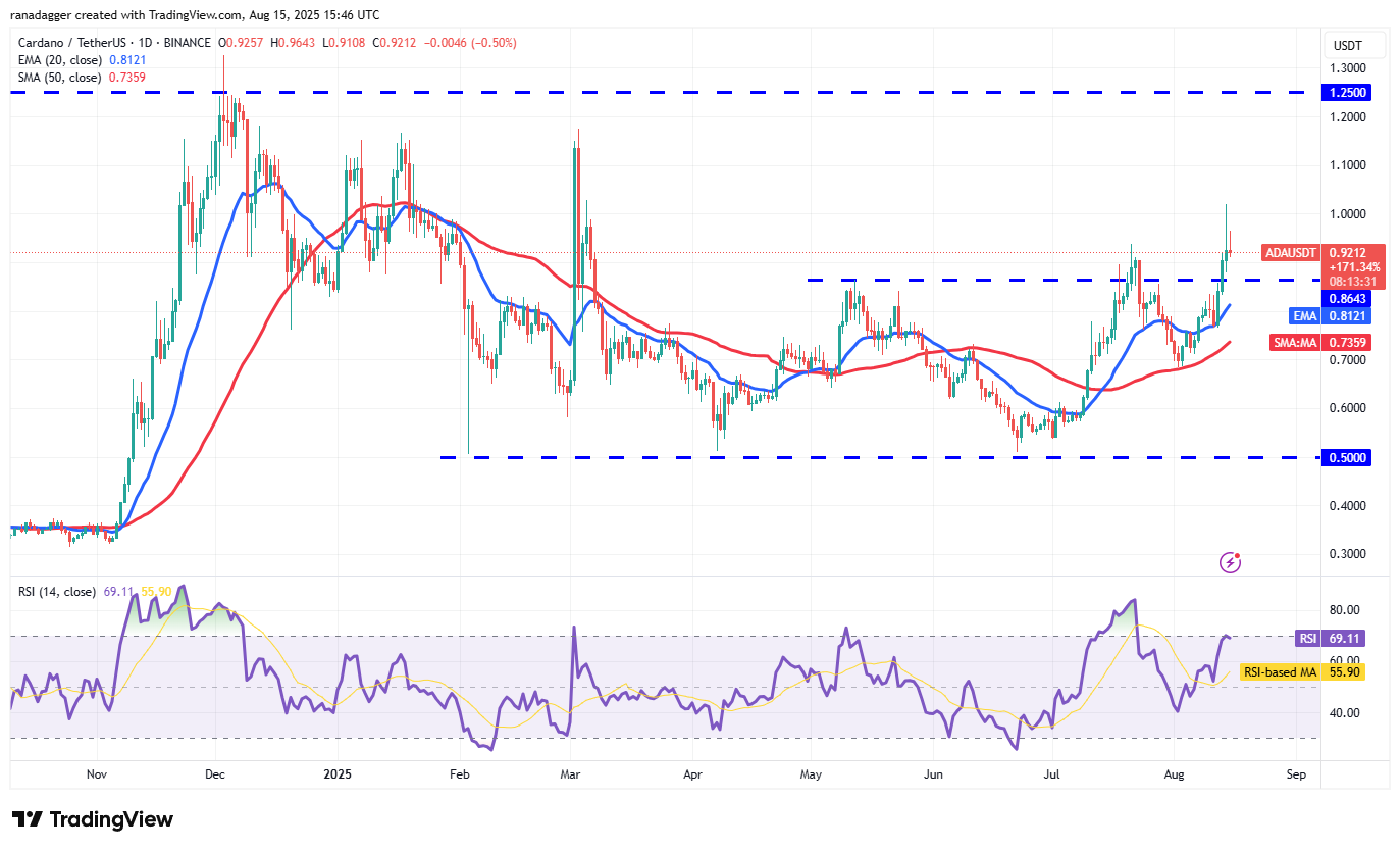 The moving averages have started to turn up, and the RSI is near the overbought zone, indicating that the bulls remain in control. Buyers will again try to propel Cardanoโs price above $1.02. If they succeed, the ADA/USDT pair could surge toward the $1.17 to $1.25 overhead resistance zone.