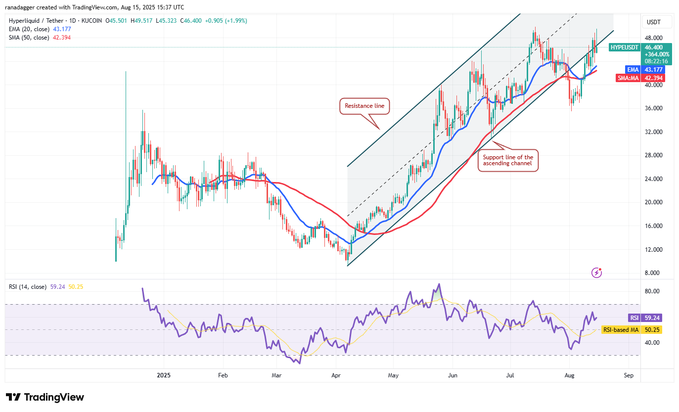 That suggests the bears are fiercely defending the zone between the channelโs support line and $50. Sellers will have to tug the price below the moving averages to gain the upper hand. The HYPE/USDT pair could then plunge to $36.