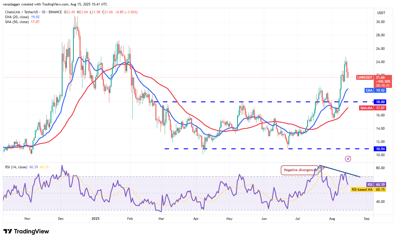 The RSI is forming a negative divergence, suggesting that the bullish momentum may be weakening. Sellers will have to pull the Chainlink price below the 20-day EMA ($20) to make a comeback. If they do that, the LINK/USDT pair could descend to $18.