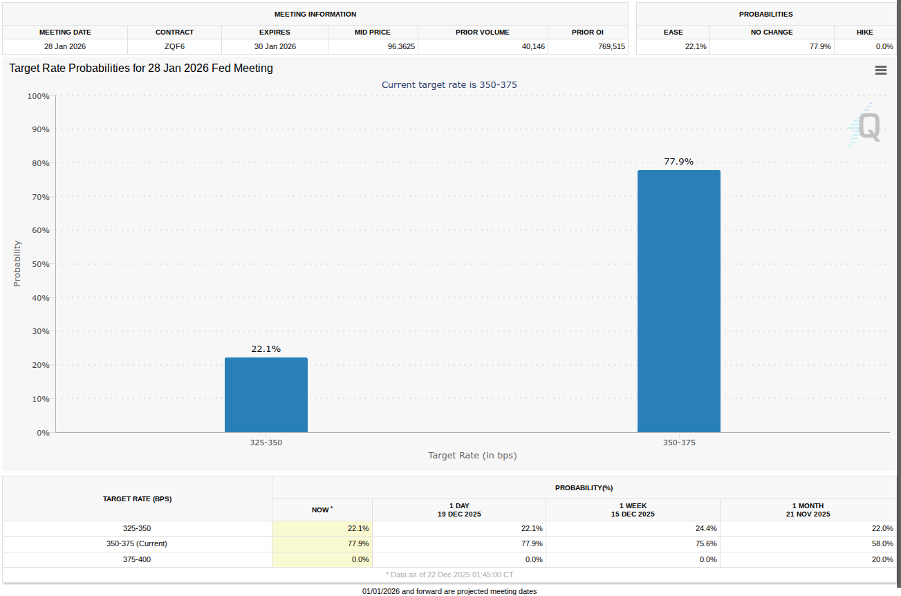When it comes to the good times continuing, market sentiment remains skeptical. Data from CME Groupโ€™s FedWatch Tool currently puts the odds of the Fed cutting rates again in January at just 22%.