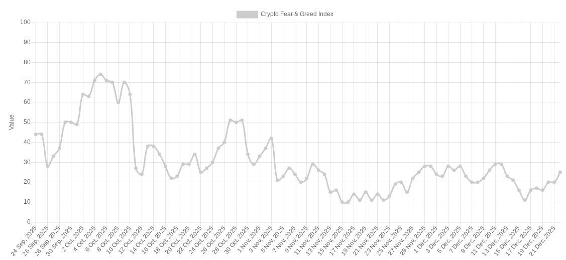 Despite that, the overall mood remains one of โ€œextreme fearโ€ at 25/100 โ€” a contrast to the 45/100 โ€œneutralโ€ reading for stocks.