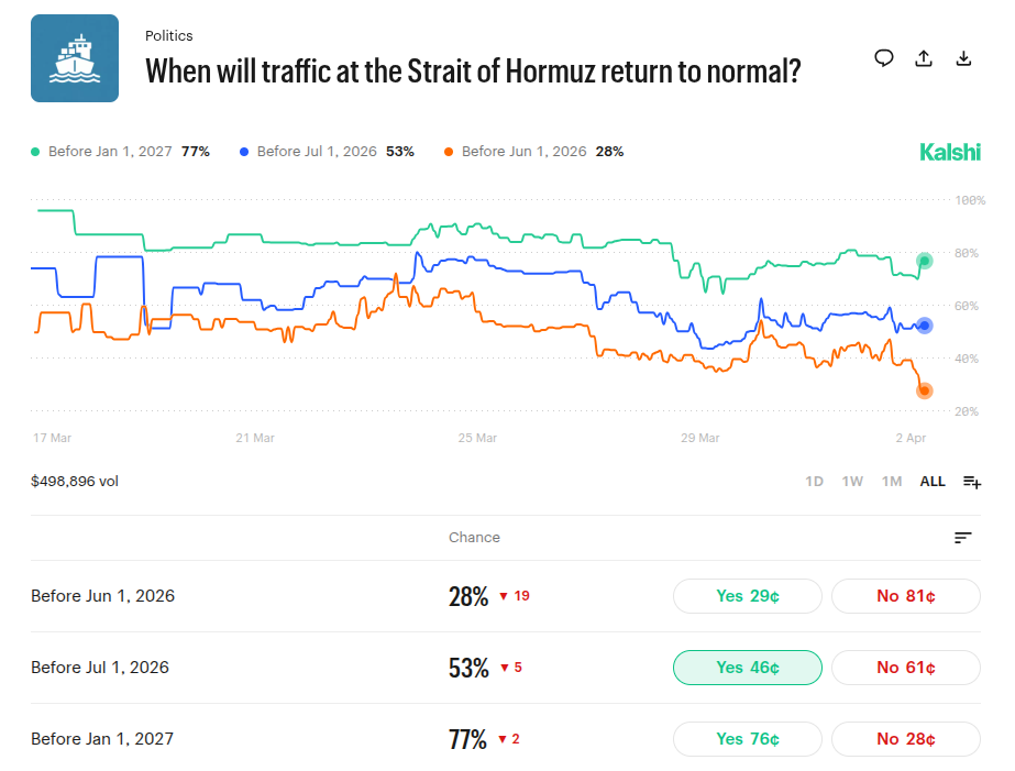 Prediction platform Kalshi showed declining odds of oil traffic reverting to “normal” levels this year.