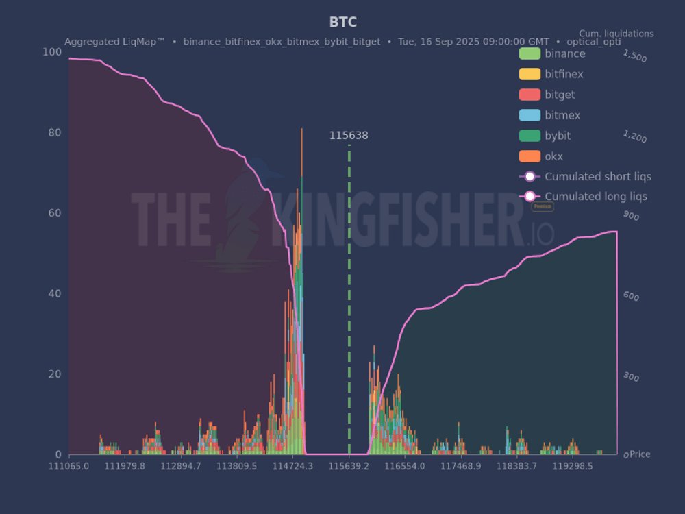 โThereโs a huge cluster of long liquidations below the current price, specifically around the 114724.3 level. Thatโs a lot of trapped longs,โ trading resource TheKingfisher observed in part of its latest commentary on X.ย