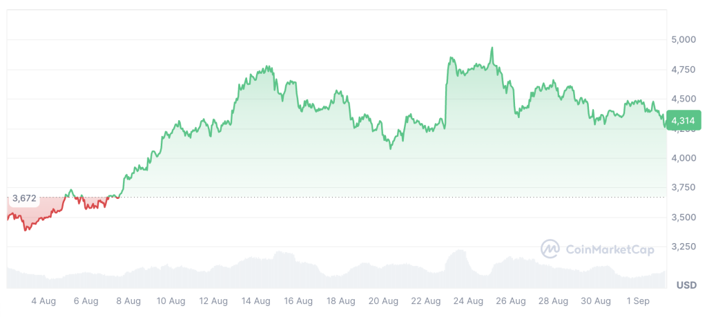 US-based spot Ether ETFs saw a massive $3.87 billion in net inflows in August. Total inflows since their July 2024 launch are up to $13.53 billion, according to Farside data.