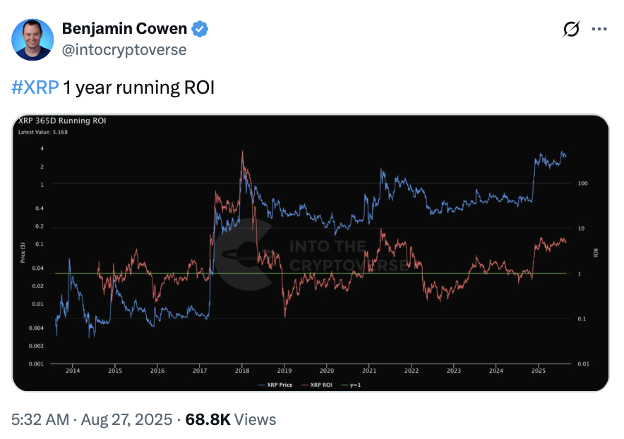 “Historically, September is a red month across markets, and normally, that would have me concerned for XRP’s near-term price, but the tariff wars have thrown seasonal patterns out of the window this year,” he explains.