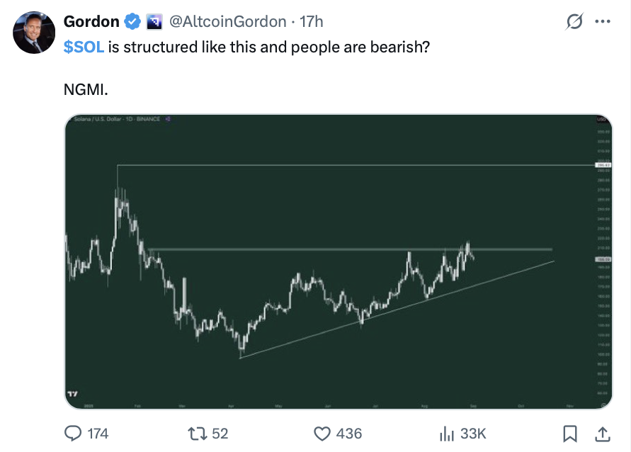 Solana is trading at $197 at the time of publication, up nearly 20% over the past month but still 49% below its January all-time high of $293.
