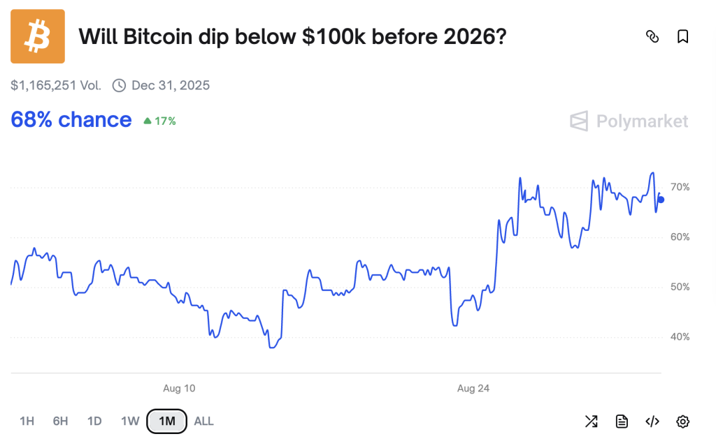 Bitcoin has a 68% chance of dipping below $100,000 again before 2026, according to crypto prediction platform Polymarket.