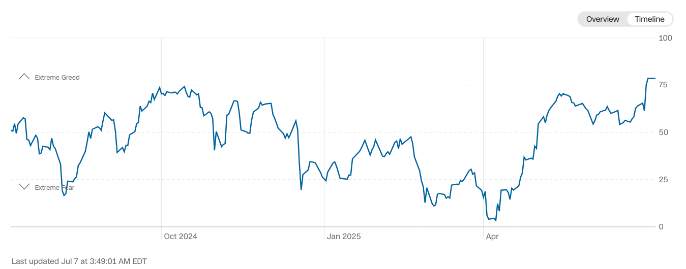 • Investor greed is rising, with the Fear & Greed Index in “extreme” territory despite macro risks.