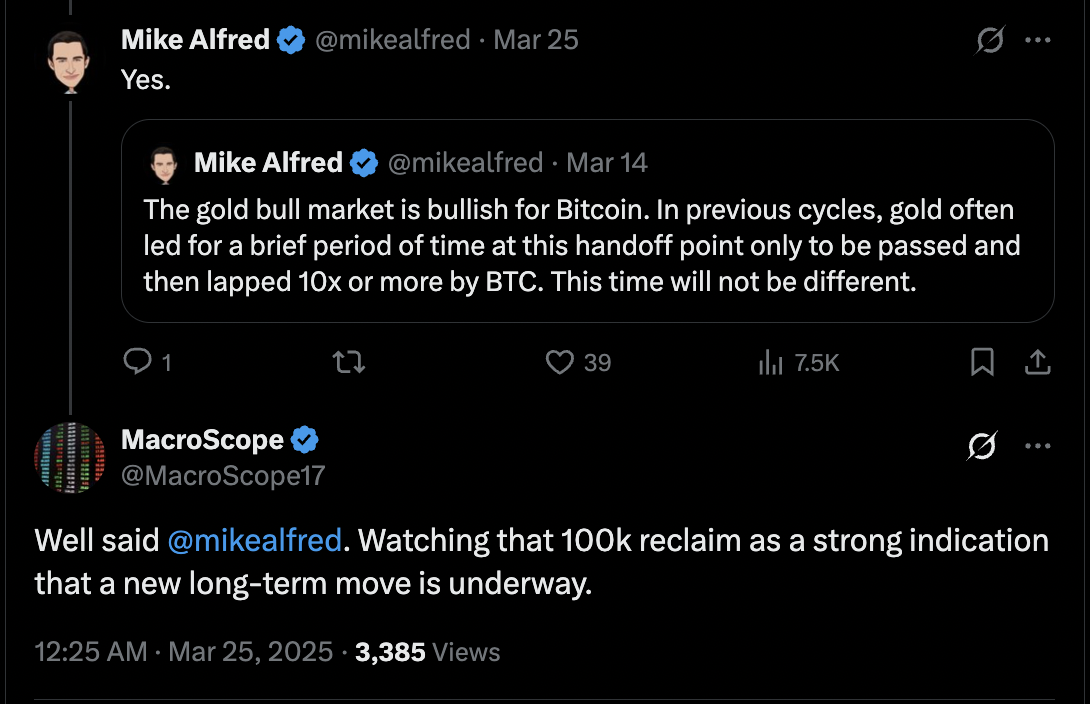 “A reclaim of $100k would imply a handoff from gold to BTC,” said market analyst MacroScope, adding: