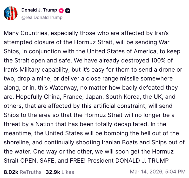 As a result, WTI crude oil fell below $100 per barrel, while gold retested the $5,000 mark as support, meeting its 50-day simple moving average (SMA) for the first time since early February.