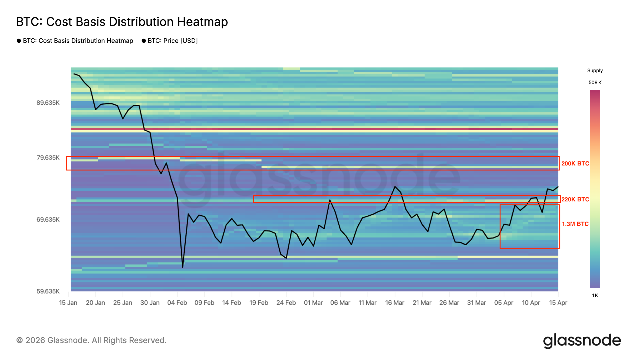 The importance of this resistance level is reinforced by cost basis distribution. The heatmap below shows that over 200,000 BTC were acquired for around $78,000.