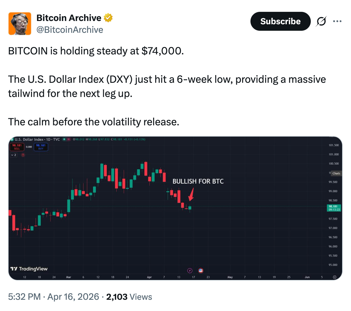 Fellow analyst Bitcoin Archive focused on the falling US dollar index, saying that it provides a “massive tailwind for the next leg up” for Bitcoin.