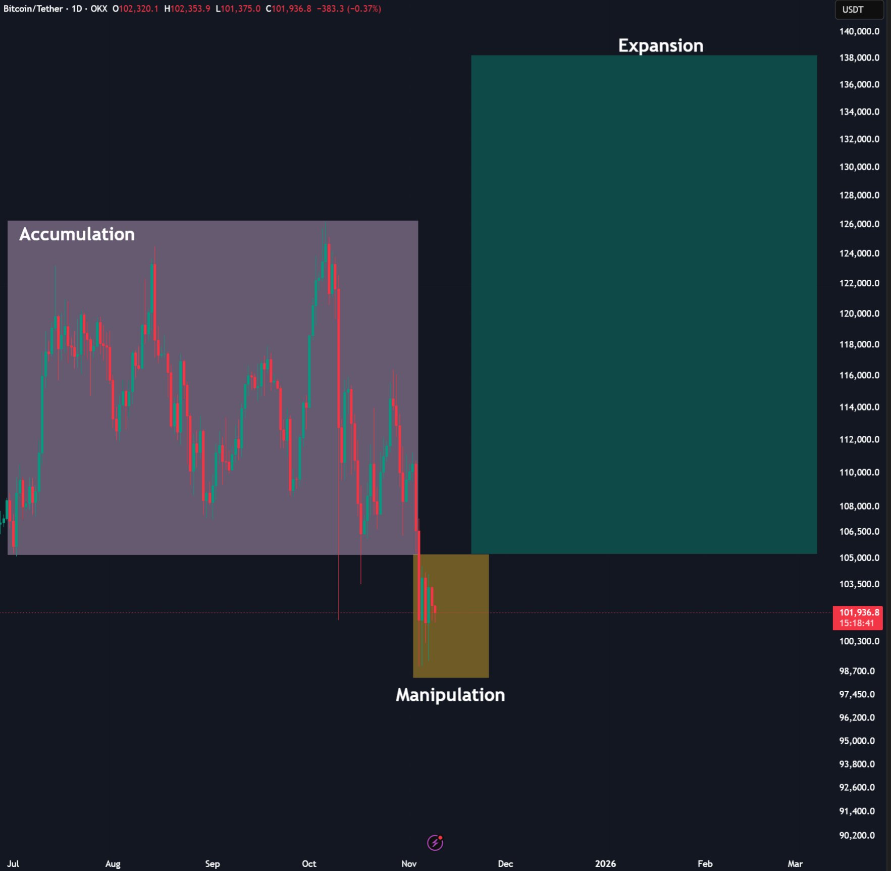 Abbe uploaded a chart to X, which suggested that the end of the shutdown could also mark the end of a “manipulation” phase for BTC price action.