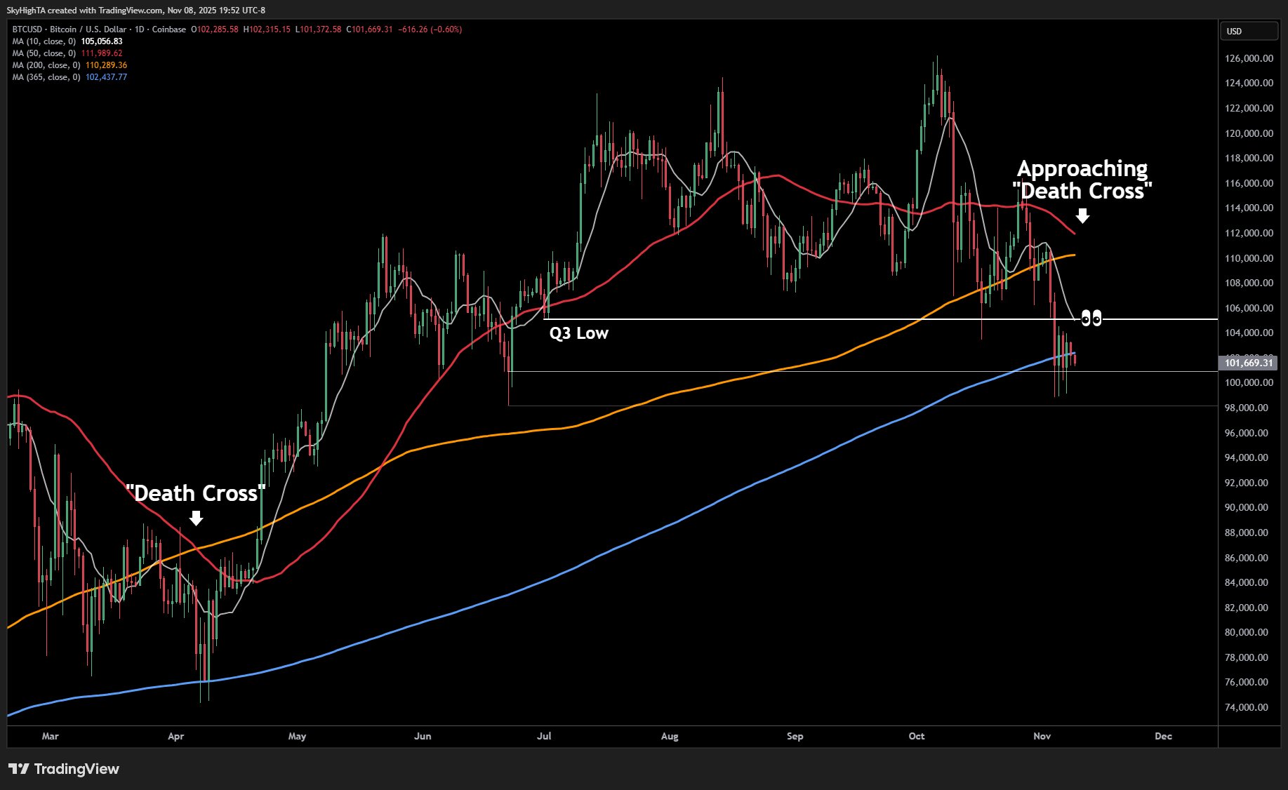 “The 4th ‘death cross’ of the bull cycle is approaching. Each time we’ve seen reversion to the mean and a sustained bottom,” he told X followers on the day.