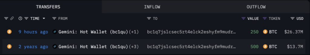 Based on reports, a long-dormant Bitcoin whale made a surprise move this week, snapping up 250 BTC for about $26.37 million. It’s the first time this wallet has shown activity in two years.