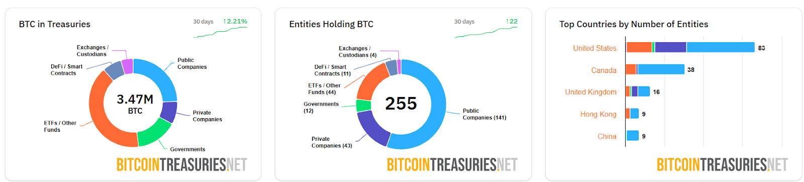 At least 255 companies are now holding a total of 3.47 million Bitcoin on their balance sheets — around 3.97% of the total supply — up from 124 just weeks ago, according to BitcoinTreasuries.NET.