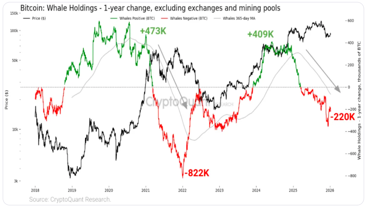 • Whale holdings drop by around 220,000 BTC in 2025.