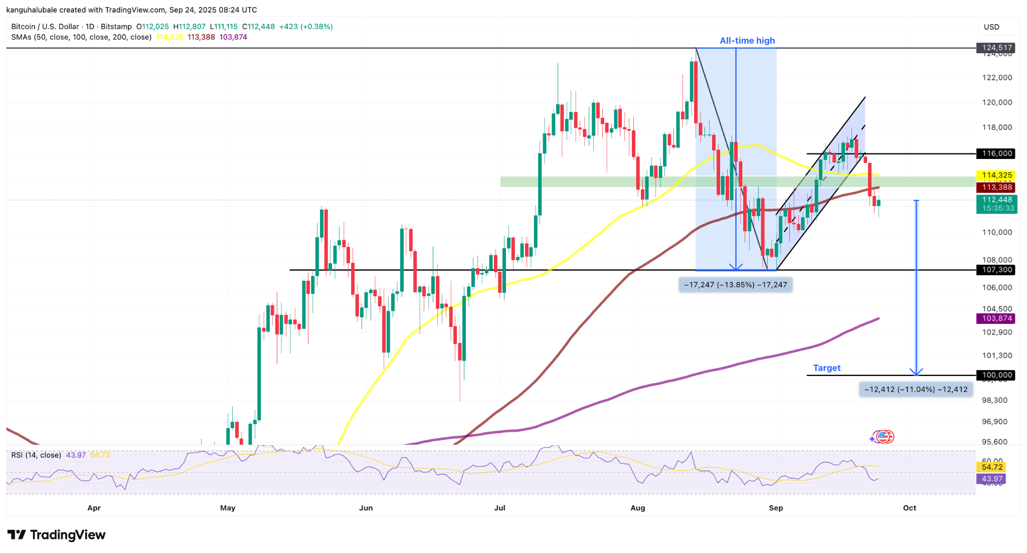 BTC price bear flag targets $100,000 if support breaks.