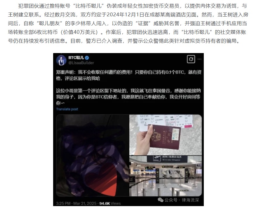 On March 25, Sina Finance reported that in 2024, a software engineer in Chengdu was ambushed and robbed of 6 BTC by a criminal gang posing as a female crypto trader named “Bitcoin Cong’er.”