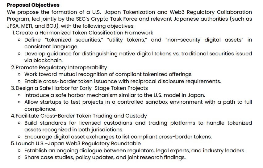 The proposal, authored by Hinza Asif, president of the Asia Web3 Alliance Japan, recommends a joint US-Japan regulatory collaboration program with five core objectives.