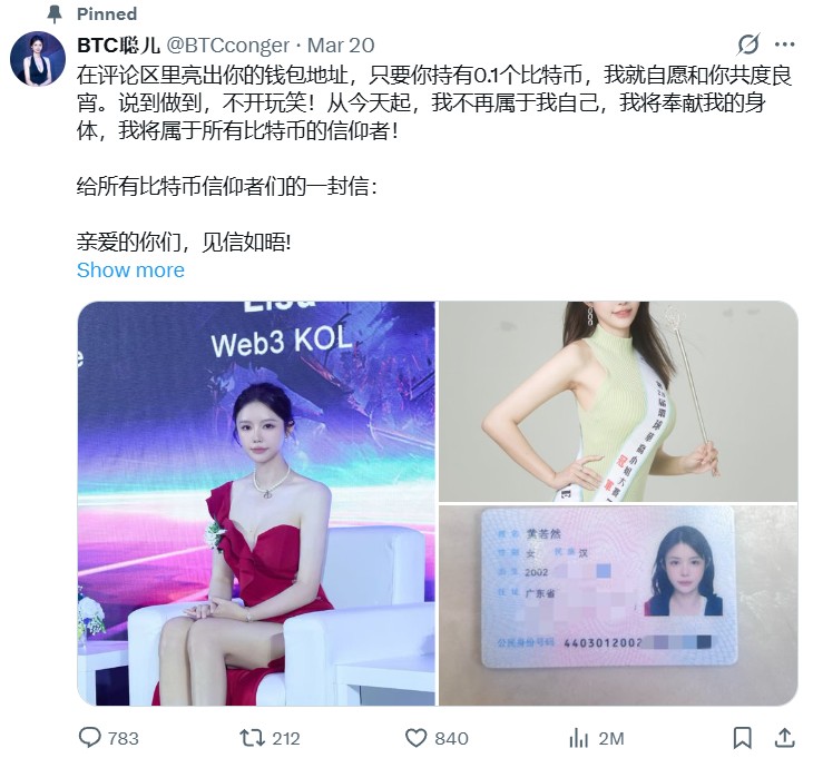 In a live-streamed interview on March 26 with local content creator Robert Lee, BTCconger denied any involvement in the Chengdu case. She stated she is currently in the mainland in Shenzhen and argued that if she were connected to a crime, she’d already be under arrest. She also pointed out that the extortion case occurred earlier in 2024, while her account only rebranded from @LisaaBuilder to @BTCconger “a few days ago.” She said she has gathered notarized evidence and plans to file a formal report to defend herself.
