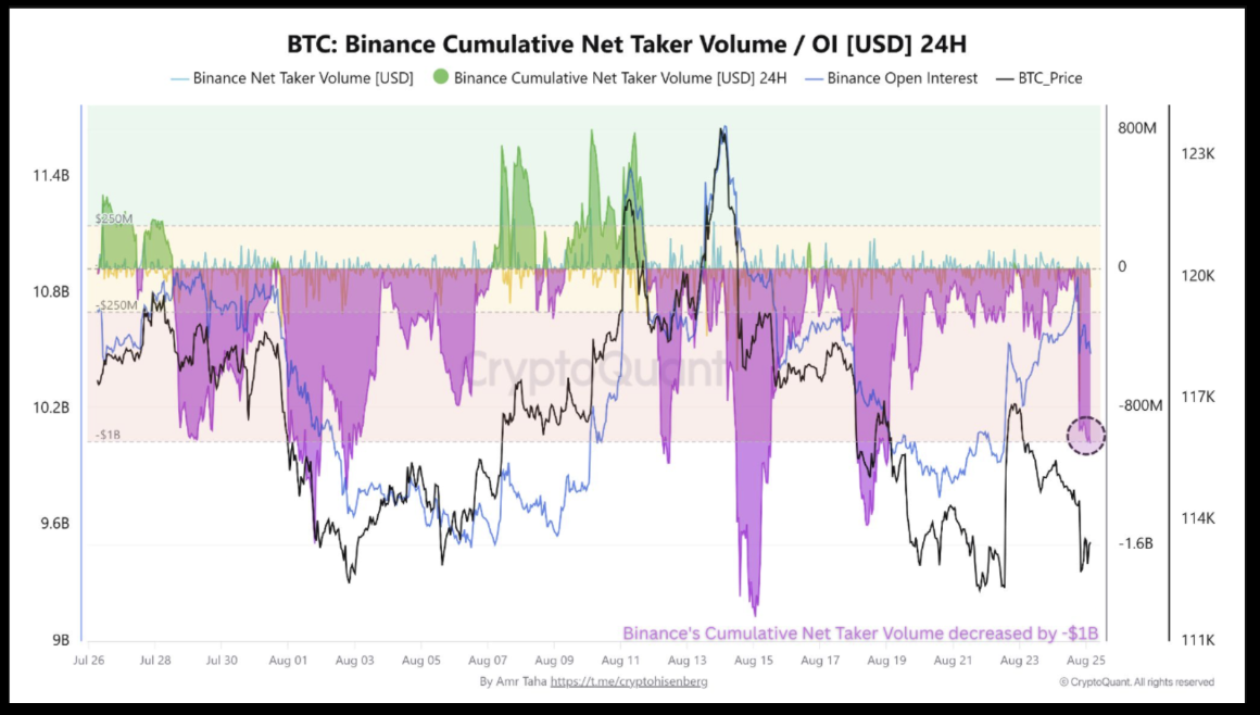 Open interest (OI) dropped significantly after the liquidation event. Binance Cumulative Net Taker Volume plunged by around $1 billion, indicating aggressive sell-side dominance and capitulation among late buyers.
