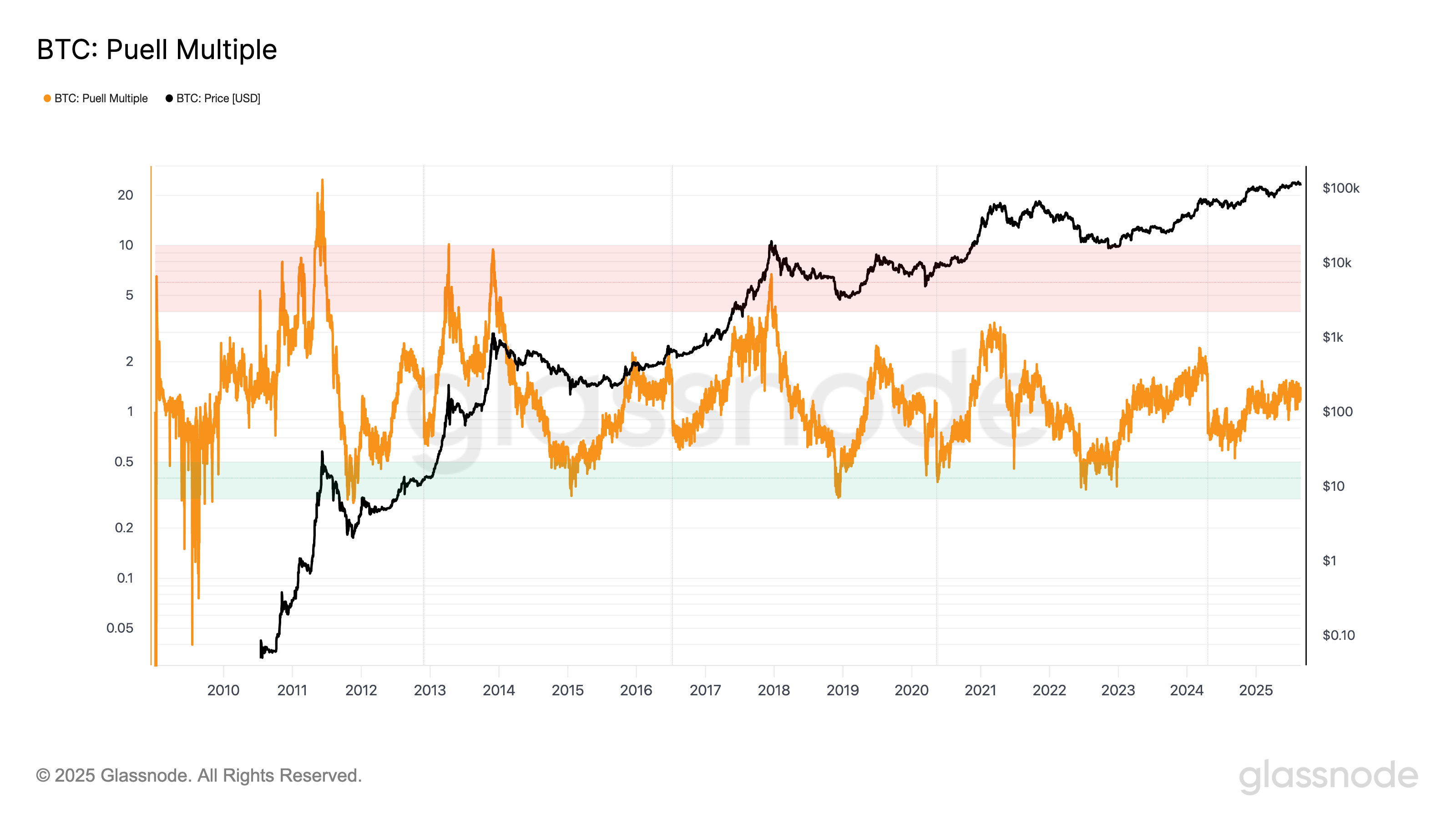 For instance, the Puell Multiple, which spikes when miners earn unsustainably high revenues, is sitting at just 1.39, well below the 2.2 danger zone seen before past price peaks.