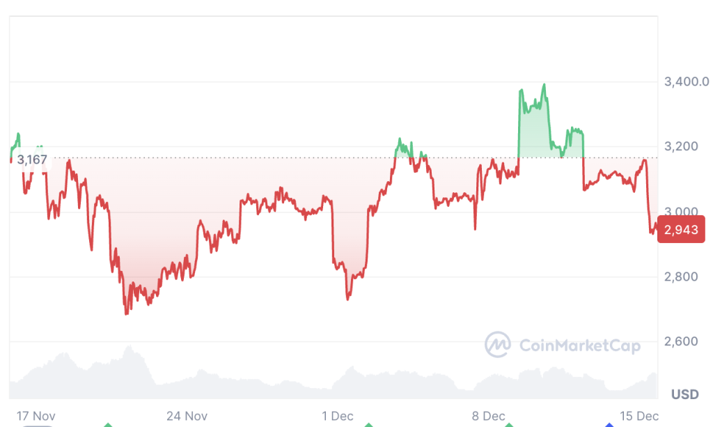 Ether is trading at $2,943 at the time of publication, down 6.28% over the past 30 days, according to CoinMarketCap.