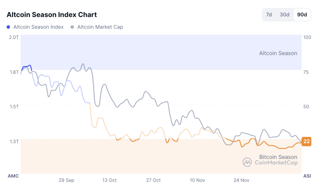 More broadly, crypto market participants remain cautious and risk-averse, with CoinMarketCap’s Altcoin Season Index at 22 out of 100.