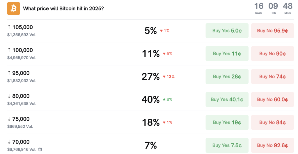 The odds of Bitcoin ending the year at $95,000 are sitting at 27%.
