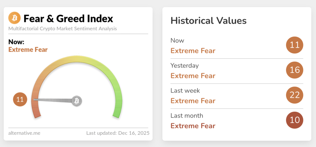 The Crypto Fear & Greed Index, which measures overall crypto market sentiment, is reading an “Extreme Fear” score of 11, after almost getting out of the fear region altogether when it registered a “Fear” score of 29 on Dec. 12 after Bitcoin almost reclaimed $95,000.