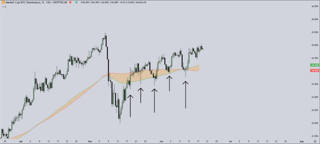 Each time, the support band held firm. More recently, dominance dipped to 61% on May 14 after peaking at 65% on May 7, only to recover to 64% in a matter of days.