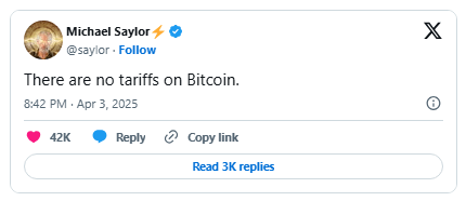 There are no tariffs on Bitcoin,” Saylor wrote in his X post. His statement comes as market watchers track how the cryptocurrency market responds to the new tariff increases. According to reports, many investors worried about how Trump’s April 2 “Liberation Day” plans would affect crypto prices. But these concerns haven’t caused major price drops so far.