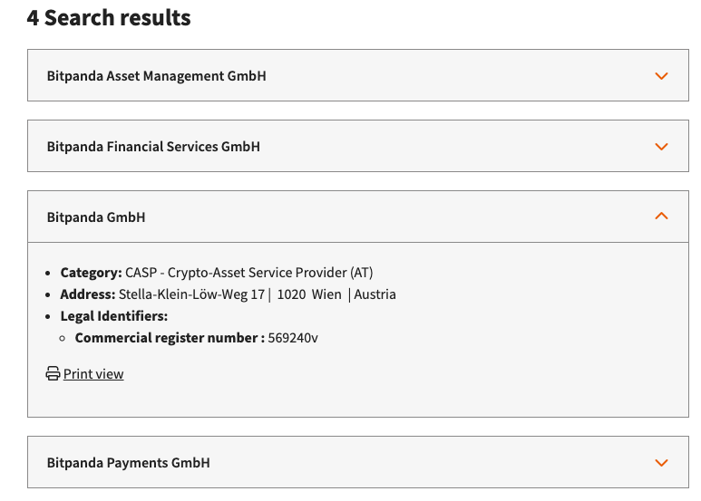 According to Austria’s FMA records, Bitpanda currently holds four different approvals in Austria and Germany for entities including Bitpanda Asset Management GmbH, Bitpanda Financial Services GmbH, Bitpanda GmbH and Bitpanda Payments GmbH.