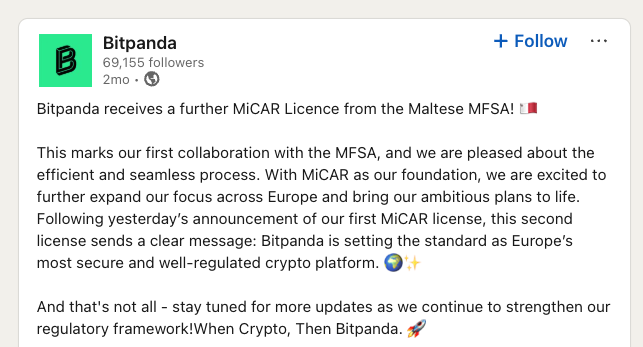 Bitpanda announced receiving a MiCA license from the MFSA in a LinkedIn post. Source: LinkedIn posting date extractor